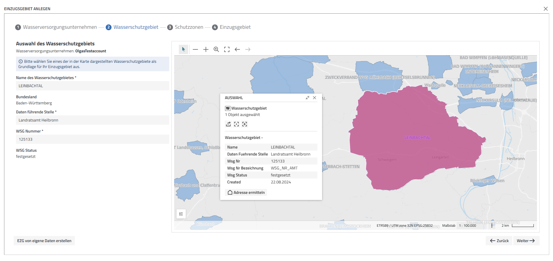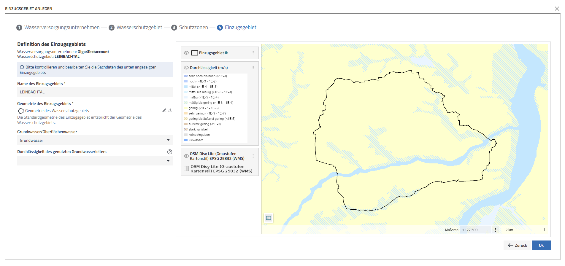 Anschließend werden alle Informationen zum Einzugsgebiet noch einmal überprüft und gegebenenfalls ergänzt: Der Name des Einzugsgebietes wird An dieser Stelle profitieren die Nutzer wieder vom RiskPlus Konzept – Anwendende soll das Risikomanagement so einfach wie möglich gemacht werden, indem möglichst viele Daten oder andere Inhalte bereits in die Software integriert sind. Die deutschlandweite Karte der Durchlässigkeit des oberen Grundwasserleiters ist z. B. in der Karte des Einzugsgebiets hinterlegt. (Quelle: BGR: Karte der Durchlässigkeit des Oberen Grundwasserleiters der Hydrogeologischen Übersichtskarte von Deutschland 1:250.000 (HÜK250))