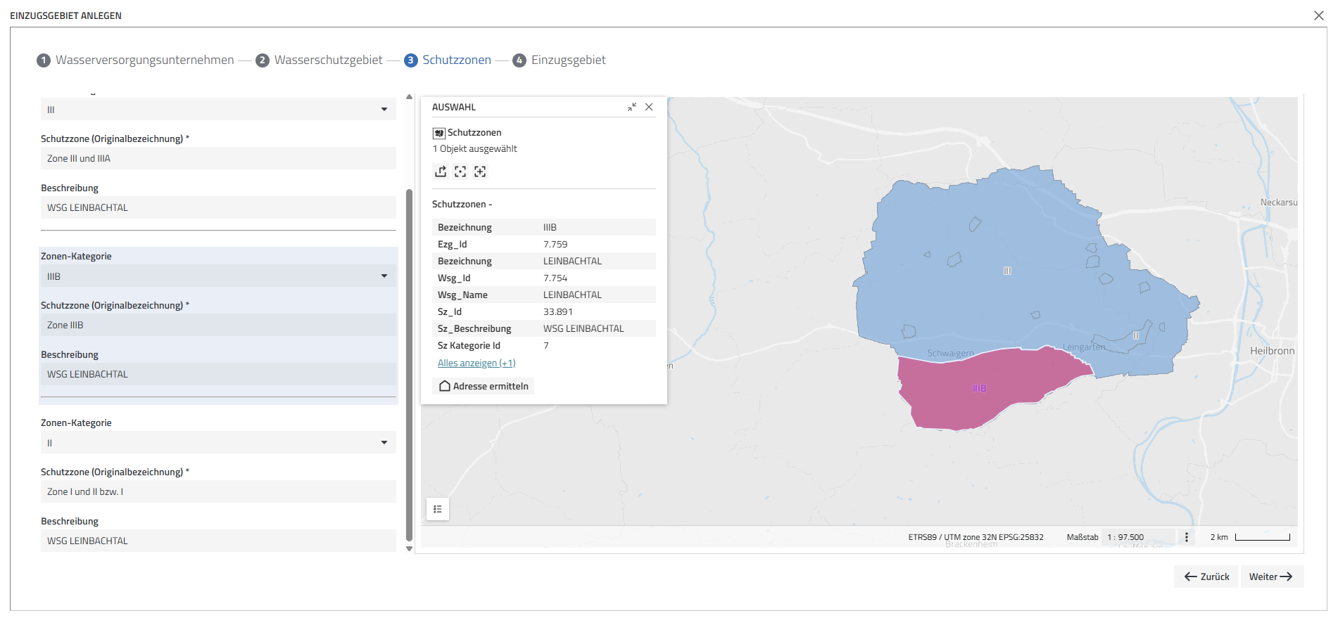 Nach der Auswahl des Wasserschutzgebiets werden die zugehörigen Schutzzonen dargestellt. RiskPlus übernimmt die originalen Schutzzonenbezeichnungen in standardisierte Zonen-Kategorien und weist diese den deutschlandweit gängigen SZ-Kategorien zu. In dieser Ansicht kann überprüft werden, ob die Zuordnung korrekt ist. Einzelne Schutzzonen lassen sich in der Karte auswählen und werden visuell hervorgehoben. Zusätzlich erscheint eine Objektinformation als „Infokasten“ über der Karte. So werden alle vorhandenen Informationen übersichtlich zusammengefasst. Falls erforderlich, kann die Zonen-Kategorie manuell angepasst werden, etwa wenn regionale Besonderheiten berücksichtigt werden müssen.
